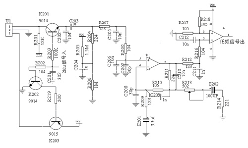 图中U1是微波感应探测器模块,通过K202,K203,R202,R219向模块提供2kHz的脉动电源(能产生频率为2khz高电平宽度为20uS的电路很多,如使用反向器CD4069、lm555等),K201在U1起作用期间导通,把U1输出的反应物体移动的低频信号选通输出,C202为采样保持电路,保证信号的连续和完整。由LM358组成的两极低通放大电路把U1的输出放大,在LM358的1脚输出。可调电阻R213用于调整一级放大器的增益,调整R213的大小可以调整探测距离。